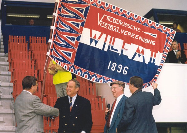 12 AUGUSTUS 1996. WILLEM II BESTAAT 100 JAAR. NAUD VAN DER VEN BIEDT VOORZITTER WIM GROELS DE NIEUWE CLUBVLAG AAN.